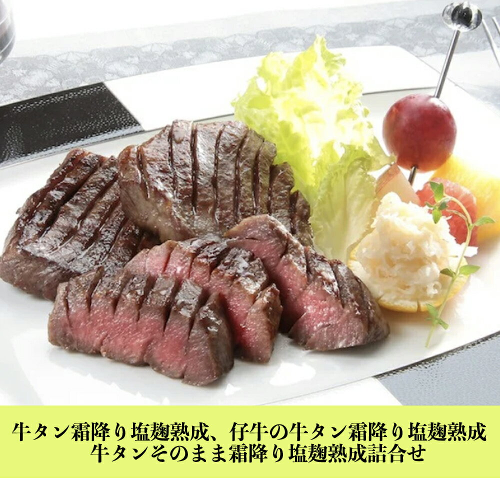 「牛タン霜降り塩麹熟成」と、同様の製法で仕上げた「仔牛の牛タン霜降り塩麹熟成」。